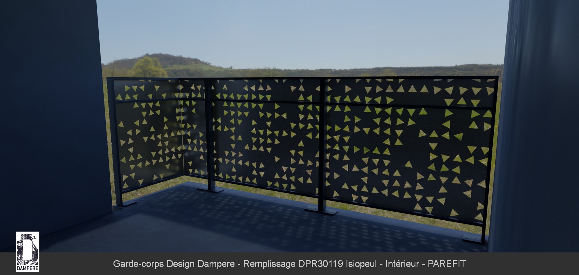 Ces formations géométriques aux contours symétriques, ajoutent une dynamique subtile que l'on voit uniquement de près. En fonction de la lumière qui traverse le panneau décoratif, la tôle perforée projette un jeu d'ombres délicats qui accentue l'effet naturel et aléatoire des découpes, apportant à l'espace une dimension graphique captivante. Le moucharabieh aléatoire dépasse la perception unique d'un remplissage de soubassement de garde-corps moderne. La découpe laser des centaines de triangles sur la tôle donne une puissante connotation graphique. Il s'agit d'un filtre de lumière permettant de captiver toute lumière avant de la retransmettre une fois filtrée en ombre projetée sur le sol du balcon. La distribution des découpes produit un effet de parcours aléatoire. Le contraste de transparence et de luminosité permet d'utiliser les découpes en prisme à leur meilleur potentiel, occasionnant une perception de nouvelle de la profondeur. La position alétoire des facettes triangulaires pemet de remplir toute forme de balcon, à la fois en couverture de nez de dalle pour une pose sur balcon à l'anglaise puis se développant en brise-soleil vertical ou en séparatif de balcon. L'occultation forte du moucharabieh métallique lui permet de cacher les objets déposés sur les balcons de logements collectifs et décore les façades de HLM.Le conseil de l'équipe