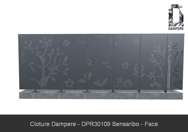 L'usage du motif SENSARIBO en panneau de clôture occultant convient sur un panneau en Acier Galvanisé d'épaisseur 2 mm avec pliage sur une hauteur de 180 cm. Cette disposition de la hauteur du poteau et l'entraxe entre panneau de 80 cm donneront une bonne résistance de la clôture occultant, que vous adapterez au scellement béton au sol selon la contrainte de la zone de vent et la sollicitation urbaine de la clôture. Le faible degré de transparence a pour effet d'augmenter la prise au vent, donc ajouter des jambes de force ou scellement plus important dans les zones fortement exposées aux rafales des vents. En cas de besoin, prévoir une peinture anti-graffiti pour faciliter le nettoyage en cas de vandalisme.Détails techniques