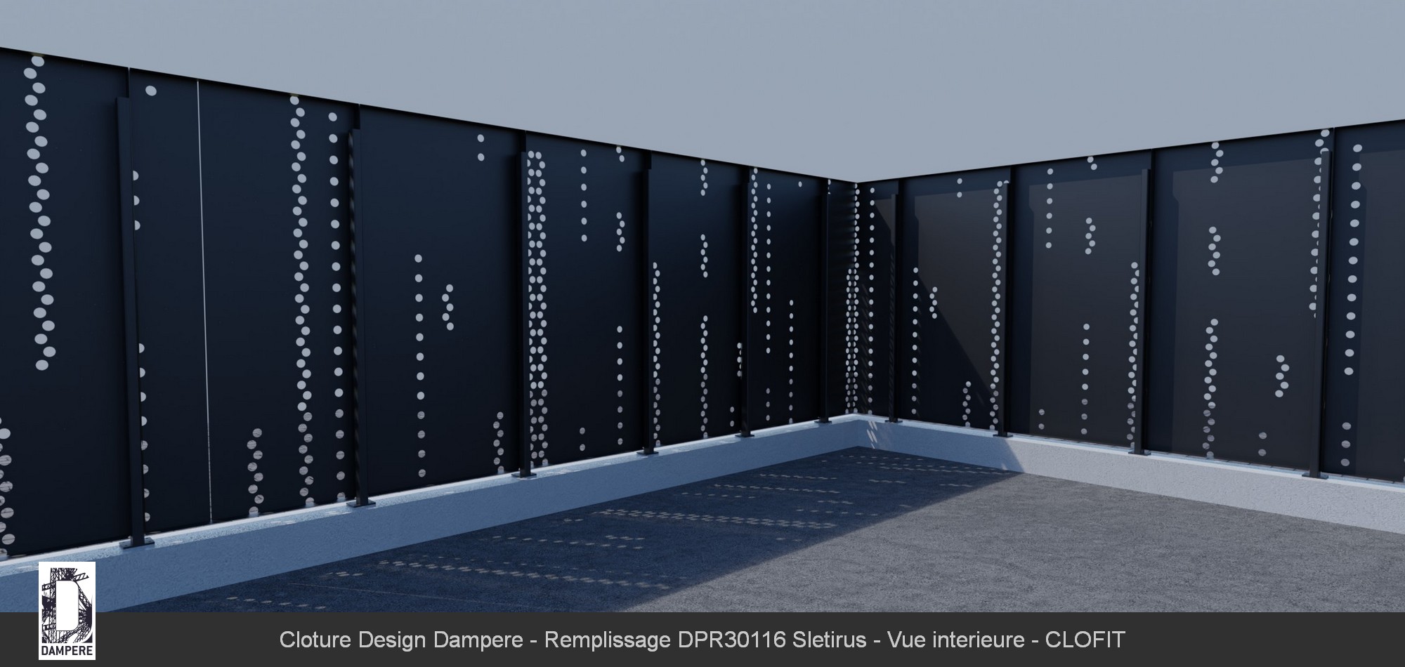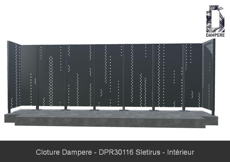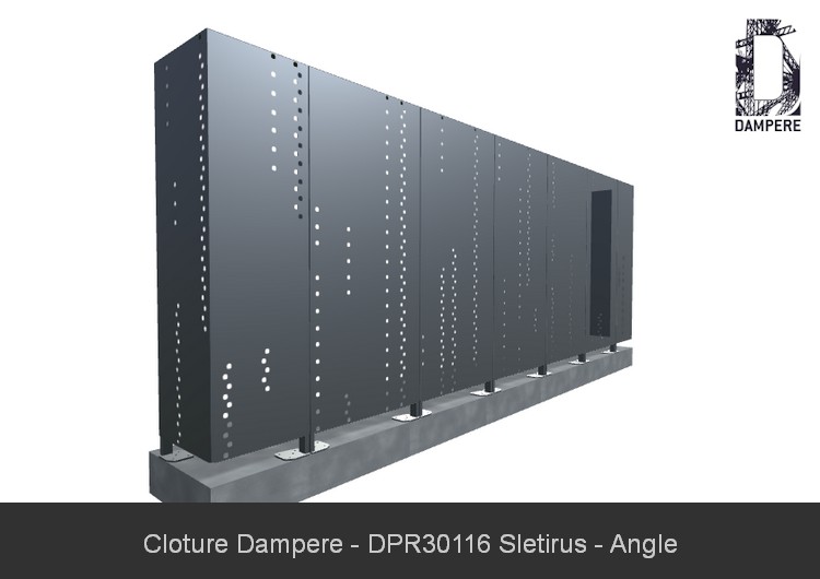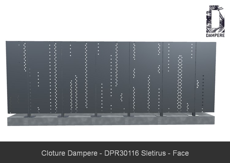 Le kit Clôture en panneau occultant Sletirus s'utilise pour des chantiers de clôtures simples avec une volonté d'opacité. La beauté de la technique de découpe numérique sur mesure permet une composition qui réduit le passage du regard au travers du panneau de clôture, plébiscité pour des installations publiques à protéger dans le cadre du plan Vigipirate en site urbain. Le motif Sletirus trouvera certainement son usage en ville ou milieu urbain à forte densité de population pour sa performance en occultation.Détails techniques