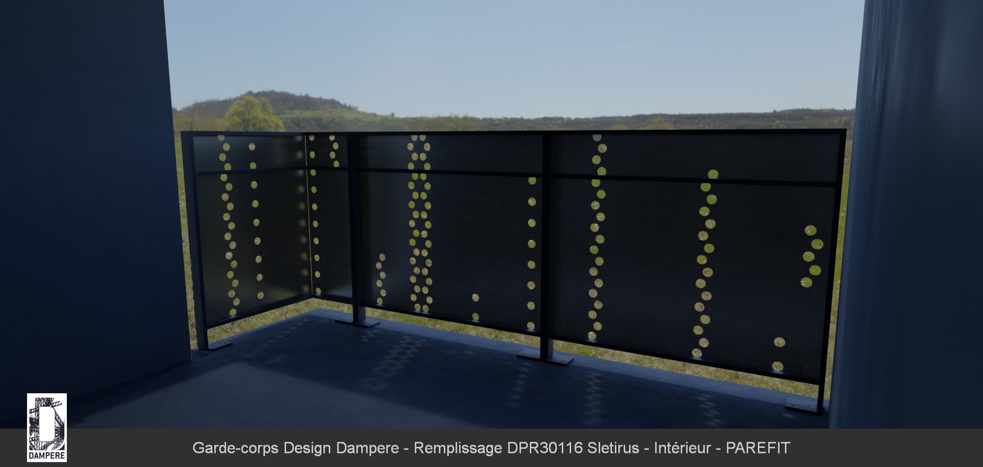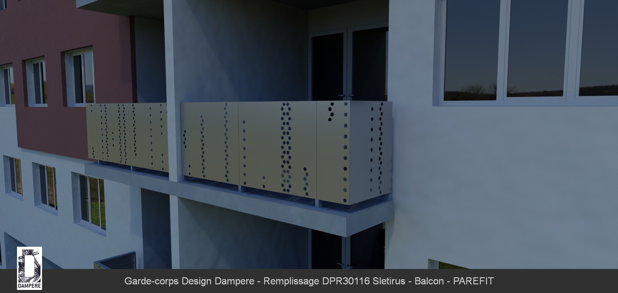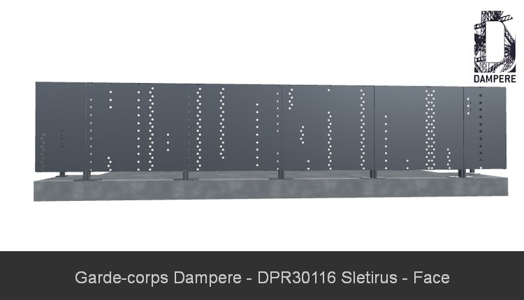 Pour utiliser la tôle décorative SLETIRUS comme remplissage dans un garde-corps, il faut tenir compte de l'opacité des lignes verticales. La disposition verticale des segments ajourés crée une sensation d'élancement et de hauteur sur le remplissage de garde corps. Cet effet amplifie la perception de l'espace du balcon, agrandi le Bâtiment tout en offrant un aspect moderne et minimaliste sur la balustrade. Les trous ronds établis en segments verticaux créent un filtre de lumière lorsque les rayons du soleil les traverse. Le design SLETIRUS sera personnalisé pour s’adapter aux dimensions spécifiques du garde-corps par le configurateur en ligne. La tôle décorative sera proposée dans différentes finitions de peinture RAL thermolaquée pour répondre aux exigences esthétiques et environnementales du PLU, avec la possibilité de choisir tous les RAL sans limite dans le design.Le conseil de l'équipe