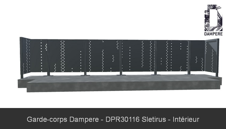 La tôle décorative SLETIRUS pour remplissage de soubassement de garde corps présente une distribution originale de lignes verticales segmentées. Les segments perforés, soigneusement espacés sur le panneau, semblent s’allonger ou se contracter de la dalle à la main courante à intervalles largement espacés, évoque une sensation de tramage pixélisé, renforçant l'impression de mouvement et de rythme linéaire sur l'habillage du garde corps.Usages