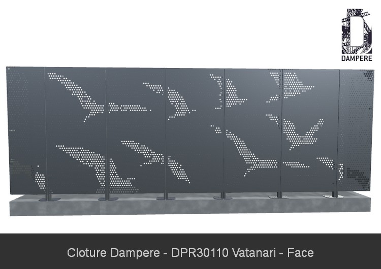 La tôle perforée en clôture décorative Vatanari DAMPERE se distingue par sa capacité à allier protection et poésie urbaine, offrant une solution idéale pour sécuriser des espaces publics tout en stimulant l'imagination de ceux qui la contemplent. Le motif perforé représentant l'envol d'oiseaux crée une scène dynamique, où le mouvement des ailes apporte une sensation de légèreté et de liberté dans le paysage urbain. Cette tôle occultante ne se limite pas à sa fonction de sécurité : elle transforme les lieux en une œuvre visuelle qui inspire et transporte l’observateur dans un univers aérien. Utilisée pour la protection d’espaces urbains, tels que des lieux de spectacles, des zones de transport, ou des places publiques, la tôle perforée Vatanari établit un dialogue entre l'architecture fonctionnelle et l'expression artistique. Le mouvement des oiseaux évoque une fluidité et une légèreté qui contrastent avec l’environnement bâti, apportant un élément naturel et vivant à des espaces souvent marqués par la rigidité des matériaux. Cette clôture métallique devient ainsi bien plus qu’un simple dispositif de sécurité ; elle joue un rôle symbolique et créatif en connectant les habitants de la ville avec un sentiment de liberté et d'évasion. Que ce soit pour un parc public, une gare, ou des espaces culturels, la tôle Vatanari s'intègre harmonieusement, offrant à la fois protection et une dimension artistique qui enrichit l’espace tout en racontant une histoire visuelle captivante.Usages